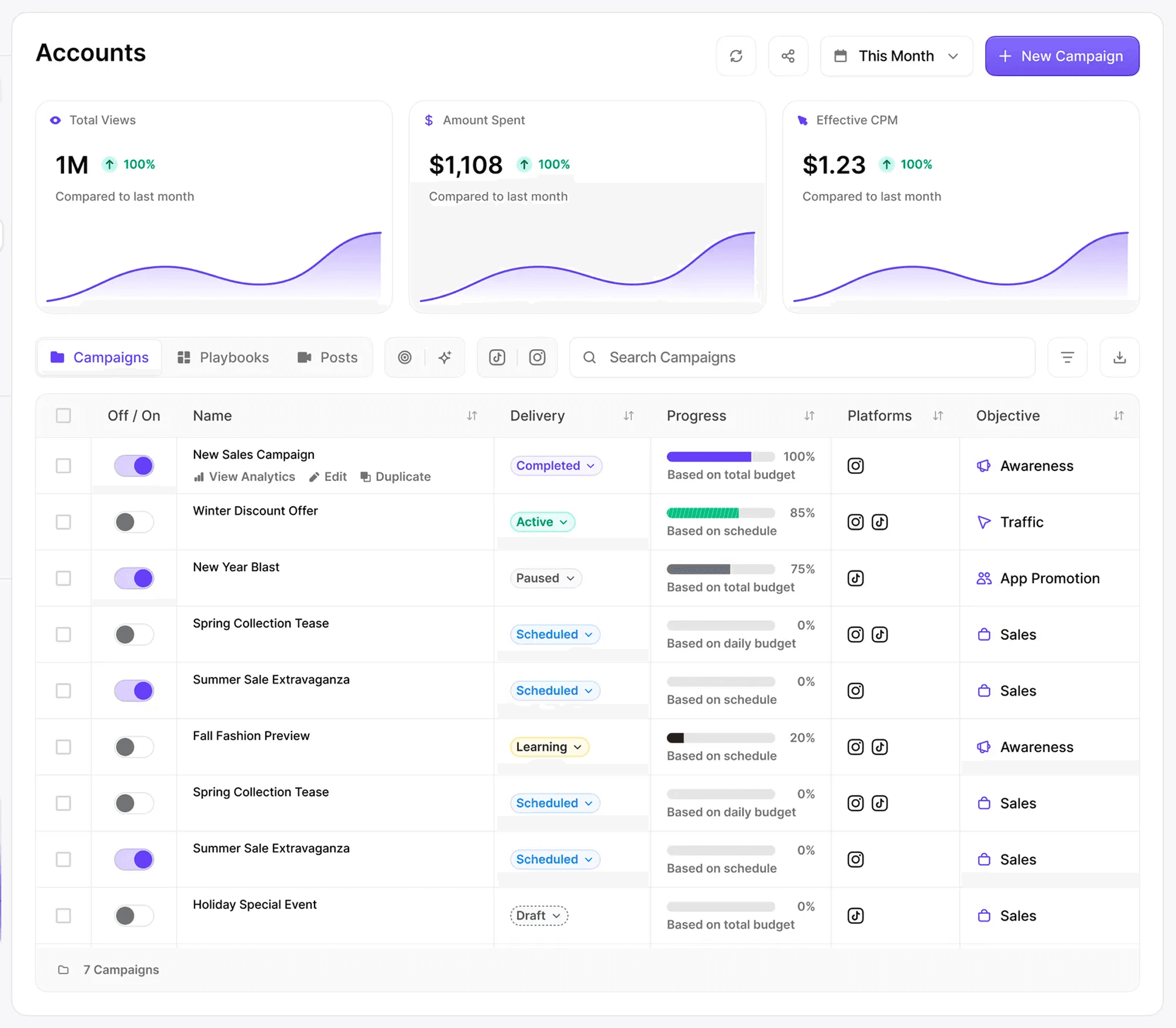 Get detailed metrics for every campaign, account, and post so you can replicate what goes viral and create weeks of content in minutes.